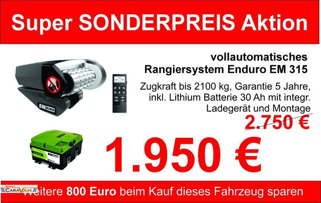 Auf Wunsch mit kraftvollem Rangiersystem Enduro EM 315 (neues Modell!) sowie Lithiumbatterie 30Ah mit integriertem Ladegerät und Montage. Anstelle 2.750 Euro für 1.950 Euro, wodurch Sie zusätzliche 800 Euro sparen können!!